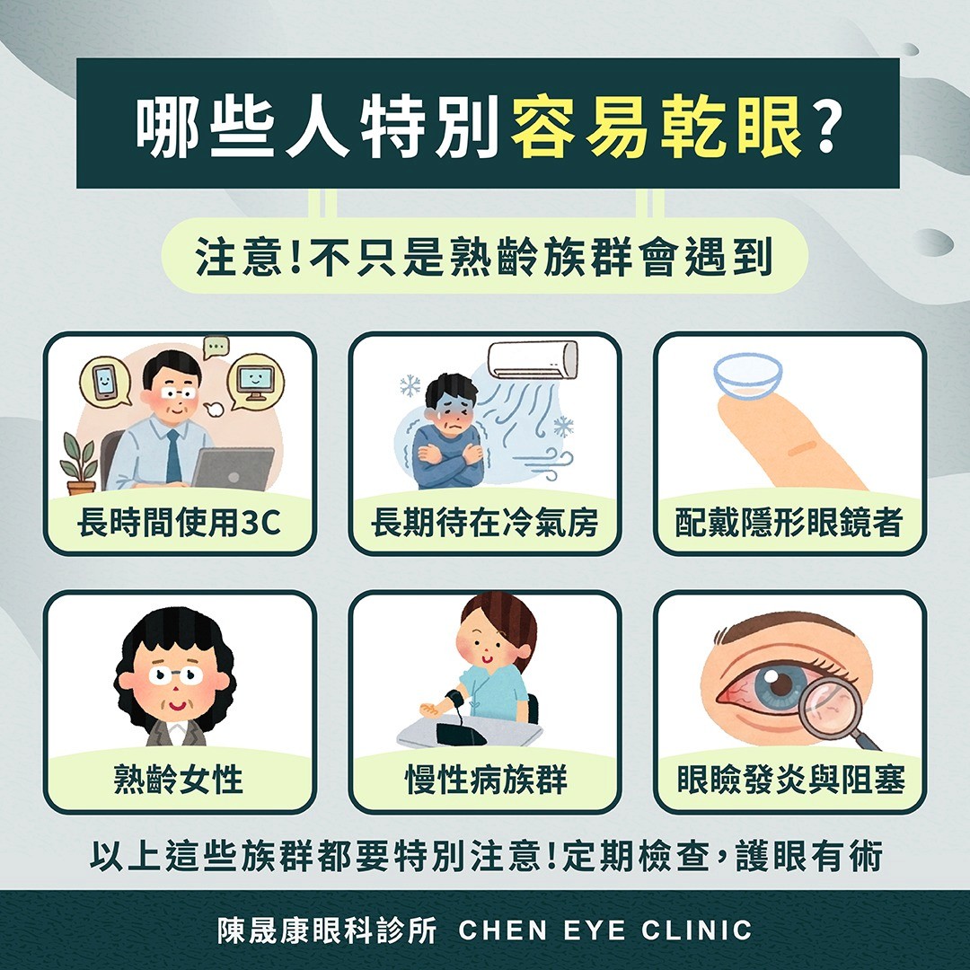 長時間用電腦、手機的上班族;長期待在冷氣房的人;配戴隱形眼鏡者;熟齡女性;本身有糖尿病、甲狀腺疾病、自體免疫疾病的人;以及有慢性眼瞼發炎、瞼板腺阻塞問題的人。