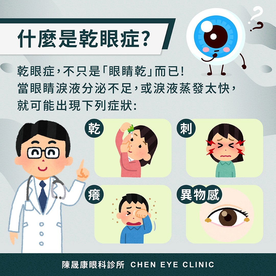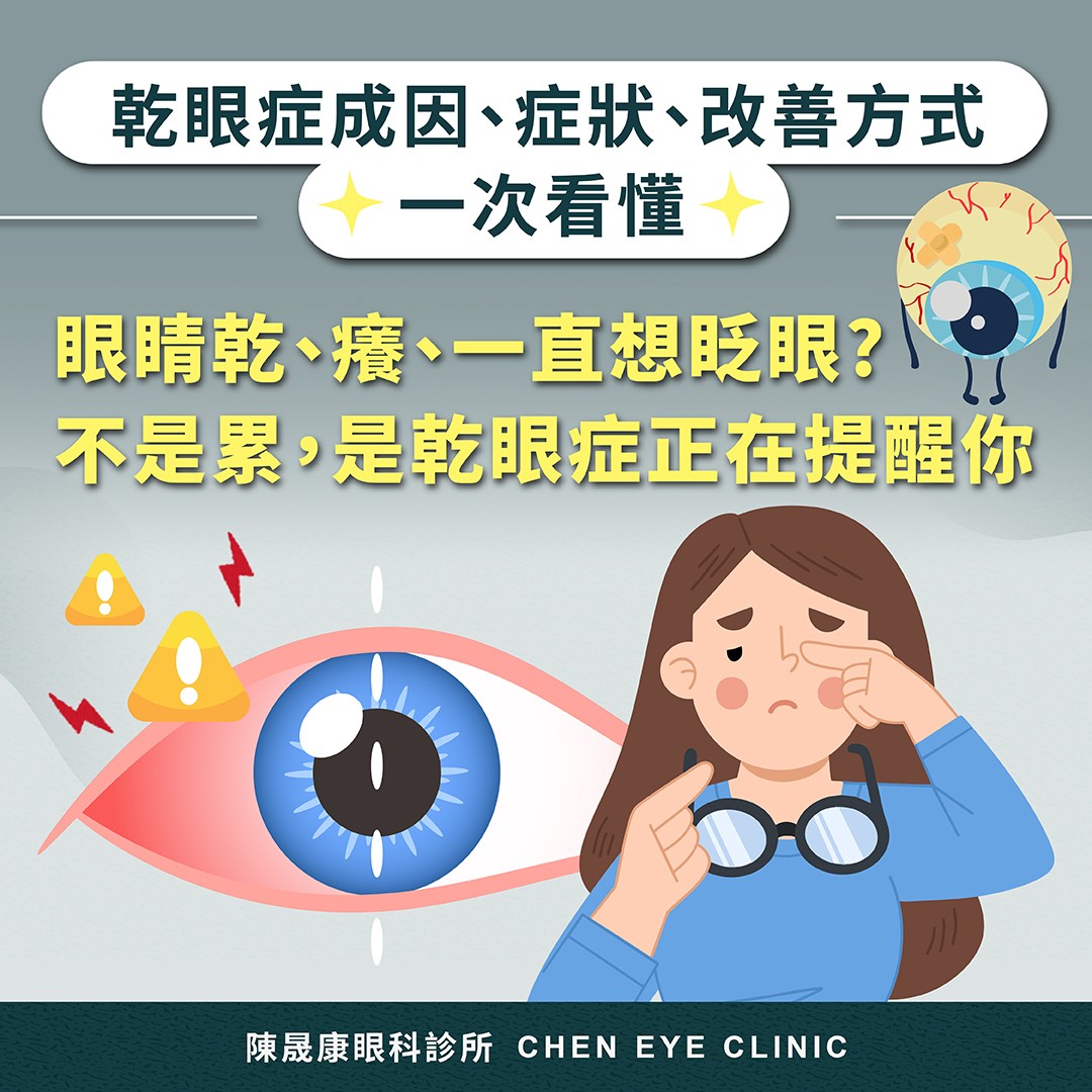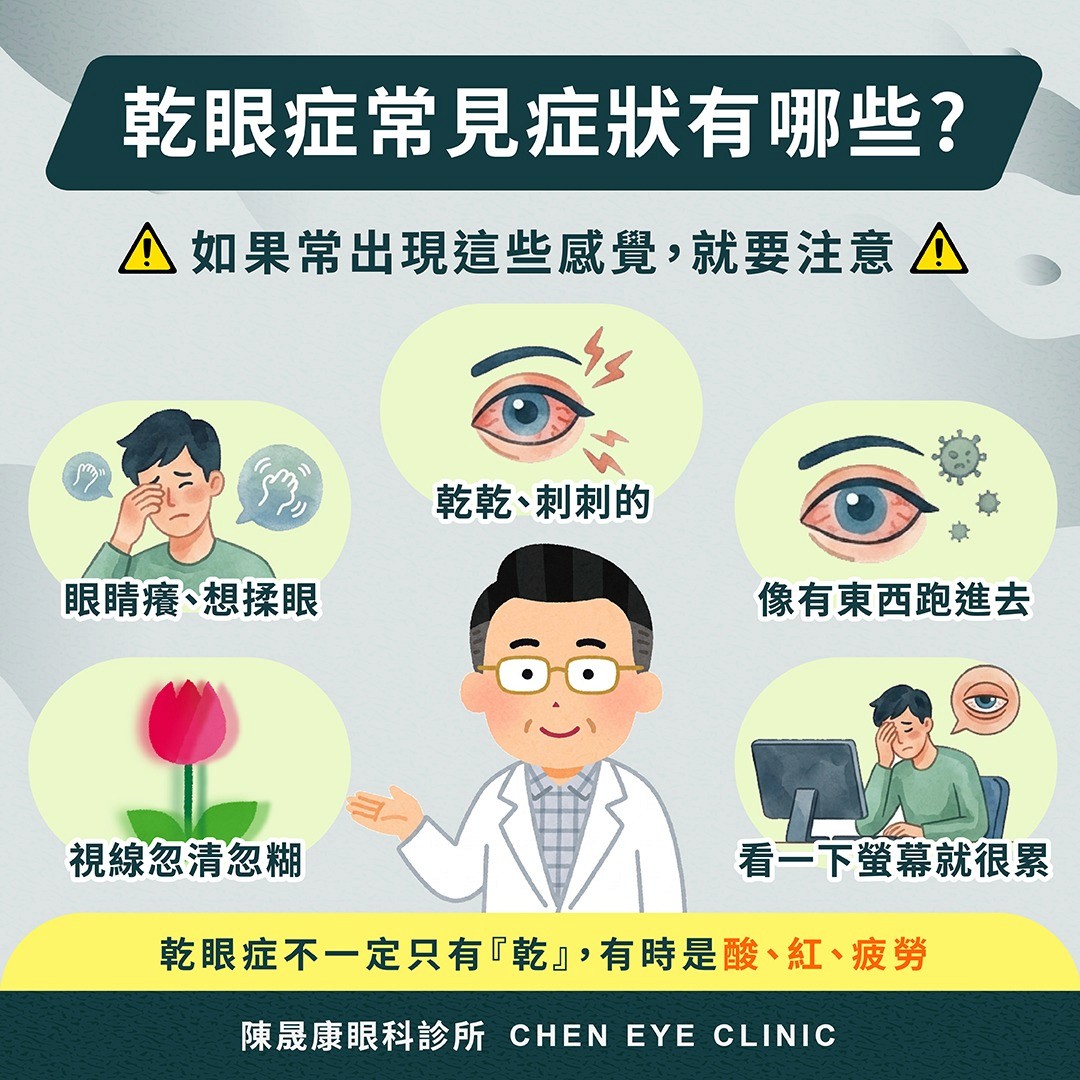 眼睛乾、癢、刺、灼熱感、像有東西跑進去;有些人會一直想眨眼,或早上起床時特別不舒服;也有人會出現短暫視線模糊、畏光、眼睛容易紅、長時間閱讀或看螢幕後很快疲勞。嚴重時,乾眼甚至可能影響角膜表面,增加感染或視力品質下降的風險。