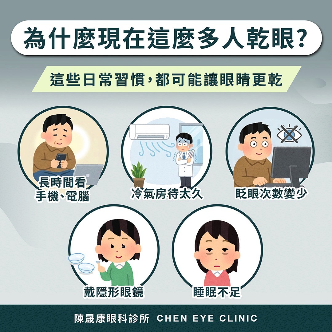 現代人乾眼症變多,和生活型態很有關係。長時間使用電腦、手機、平板時,眨眼次數會變少,眼表水分更容易流失;如果再加上待在冷氣房、長時間配戴隱形眼鏡、睡眠不足,乾眼的不舒服就會更明顯。部分藥物、慢性病,甚至自體免疫疾病,也可能增加乾眼風險。