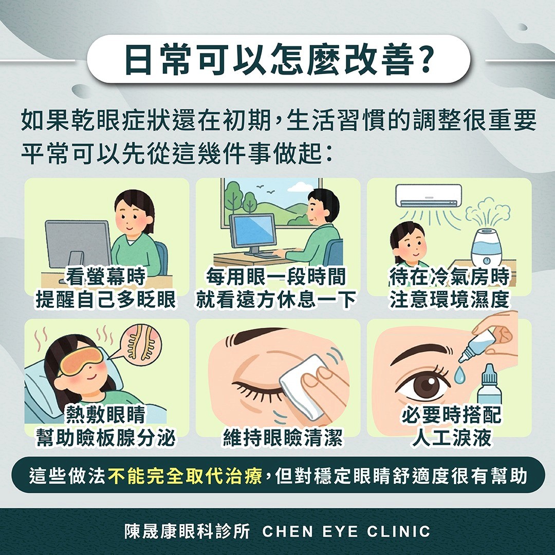 看螢幕時刻意提醒自己多眨眼;每用眼一段時間就看遠方休息一下;待在冷氣房時注意環境濕度;熱敷眼睛幫助瞼板腺分泌;維持眼瞼清潔;必要時搭配人工淚液。這些做法不能完全取代治療,但對穩定眼睛舒適度很有幫助。